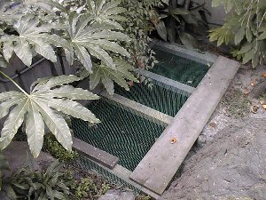 庭に埋め込んだ雨水タンク。落ち葉が入らないようにネットが施してある