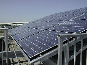 ![]() | サンヨー製ソーラーパネル。太陽電池モジュールが5×5=25枚ついている。 |